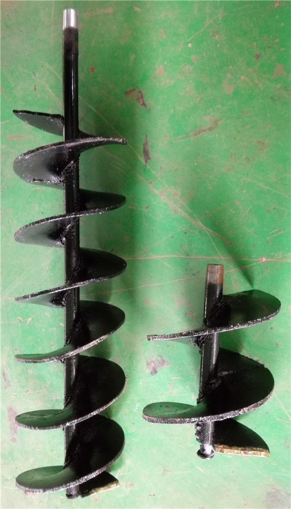 常用提土鉆(麻花鉆、螺旋鉆):葉片直徑:Φ75、Φ90、Φ110、Φ130、Φ150,大口徑有Φ180、Φ200、250、300、350、400、450、500...常用長度0.5m、1m、1.5m、2m、3m,葉片分標準和全葉兩種。